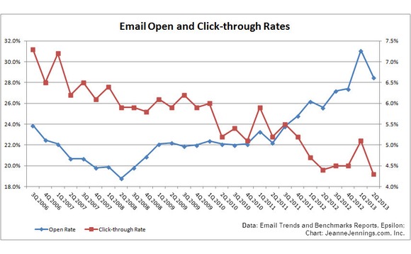 O relatório E-mail Trends and Benchmarks Report, elaborado trimestralmente pela Epsilon, mostra que a taxa média de abertura de e-mails anda em alta. De cada 100 mensagens enviadas, 28 são abertas. No entanto, a taxa de cliques em pelo menos um link da mensagem foi de apenas 4,3% no segundo trimestre de 2013. É o…